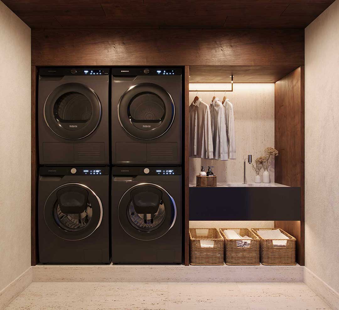 - Delivered with countertop and two-burner electric cooktop and infrastructure for washer and dryer installation.